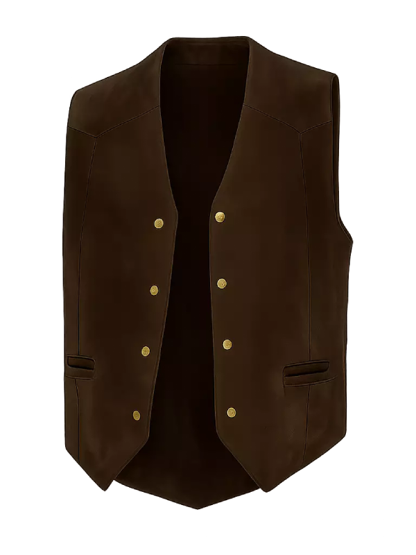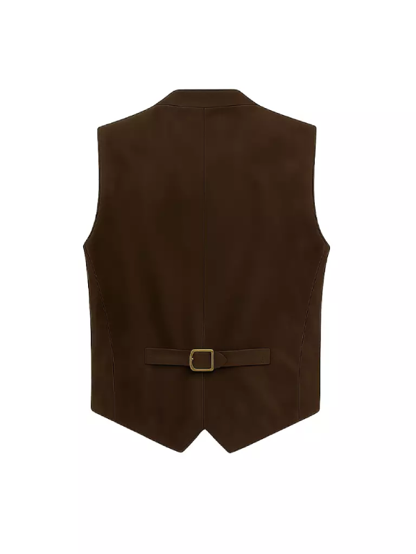 Suede leather wraps around you like quiet confidence its nap catching light in gentle waves. Inside polyester lining glides smoothly against skin keeping movement effortless throughout long days. A deep V neck collar cuts clean drawing attention without shouting.