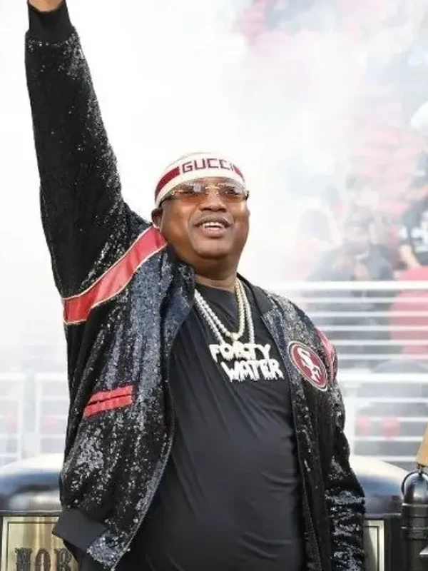 The E-40 San Francisco 49ers Sequin Jacket is a high-energy tribute to the Bay Area rap legend and his unwavering support for the Niners. Covered in shimmering black sequins, this jacket is designed to catch every light at Levi’s Stadium or on the streets of San Francisco, offering a flashy twist on traditional fan gear.