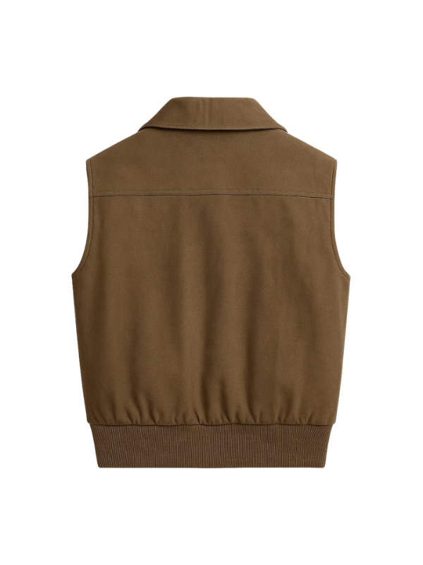 The design of the vest incorporates button closures and zippers giving it functionality as well as style. The shirt style collar not only gives the vest its structured design but its rich brown color gives it timeless design. The vest not only serves the purpose of dressing but it is also an example of fashion design.