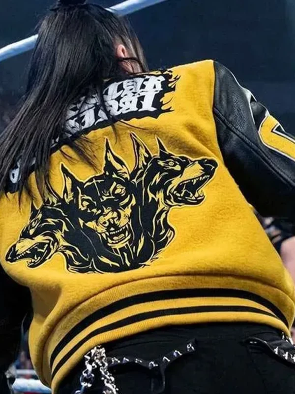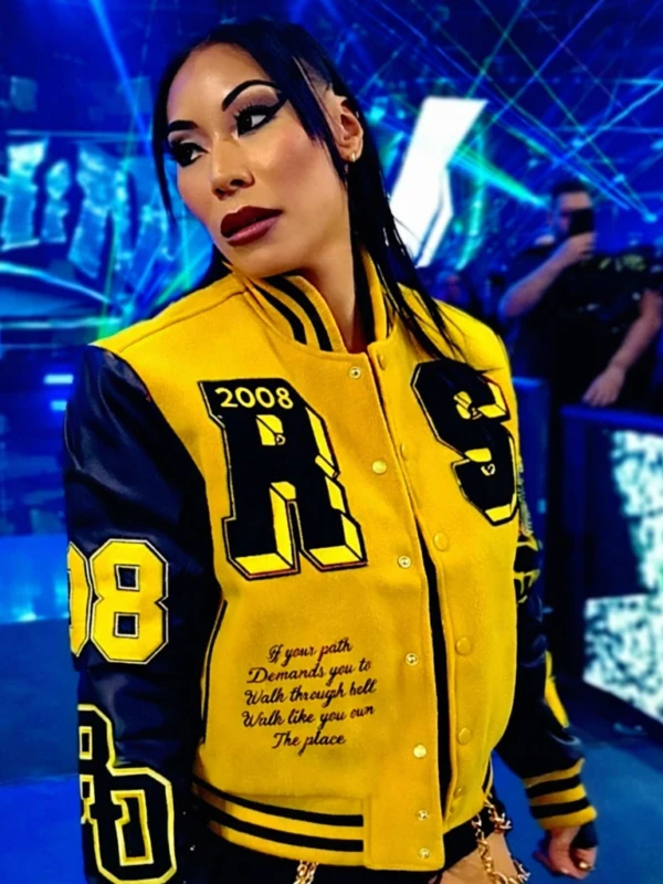 The SmackDown 2026 Mia Yim Jacket is a bold and energetic piece of outerwear that captures the “Michin” aesthetic of the dynamic Superstar. As a prominent figure on the SmackDown brand in early 2026, Mia Yim (also known as Michin) has defined her presence with a wardrobe that blends street-inspired silhouettes with high-impact athletic gear. This yellow and black varsity jacket was featured during her high-profile appearances in March and April 2026, including her intense confrontations alongside Jade Cargill. Its striking color contrast and classic collegiate design mirror the “crazy” and resilient spirit she brings to the blue brand, making it a definitive standout for fans following the 2026 wrestling fashion trends.