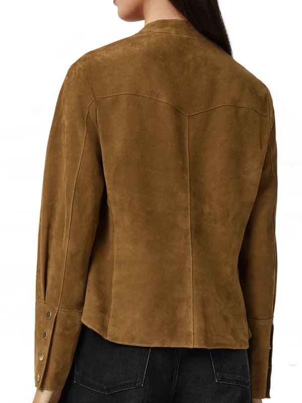 This garment is tailored from suede leather and supported by a internal polyester lining, ensuring a luxurious texture and a comfortable fit throughout the day. The design features a modern stand-up collar and a structured front button-style closure, creating a streamlined profile that is both timeless and contemporary. Built for a polished appearance, the jacket includes full sleeves that enhance its tailored silhouette, making it an ideal layer for transitional weather or professional settings. Rendered in a rich, versatile brown colorway, this Sheila Carter inspired suede jacket is a must-have for followers of the 2026 season and seekers of a high-quality, drama-inspired wardrobe staple.