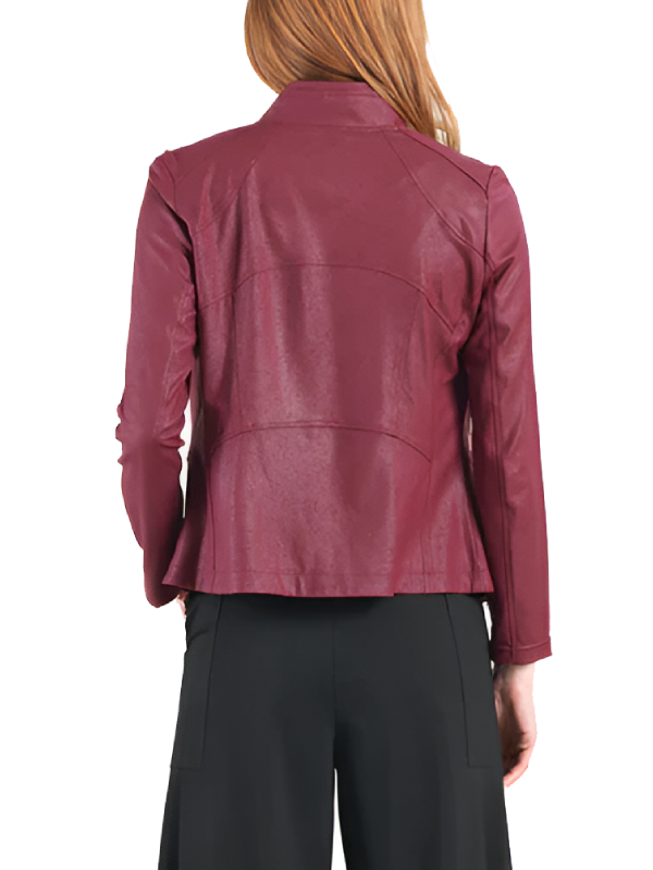Crafted from Leather with Polyester Lining, this jacket features a sleek Zipper Closure at the front paired with a defined Stand Up Collar that enhances its structured shape. Full Sleeves maintain a smooth, consistent outline. Finished in Maroon, the jacket delivers a bold yet controlled visual identity driven by color and form.