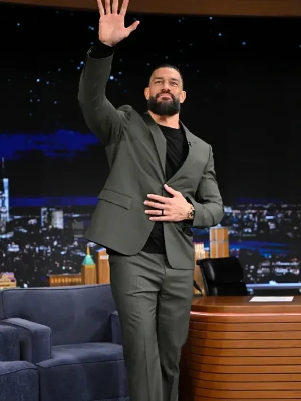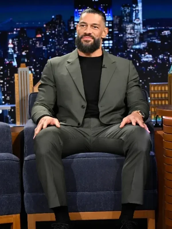The Tonight Show Roman Reigns Suit is a masterclass in modern tailored luxury, famously debuted by the “Tribal Chief” during his high-profile appearance on The Tonight Show Starring Jimmy Fallon on March 26, 2026.Universe geared up for the monumental WrestleMania 42 showdown against CM Punk at Allegiant Stadium, Reigns traded his ring gear for this striking green silhouette.