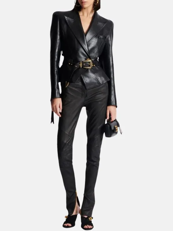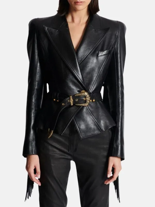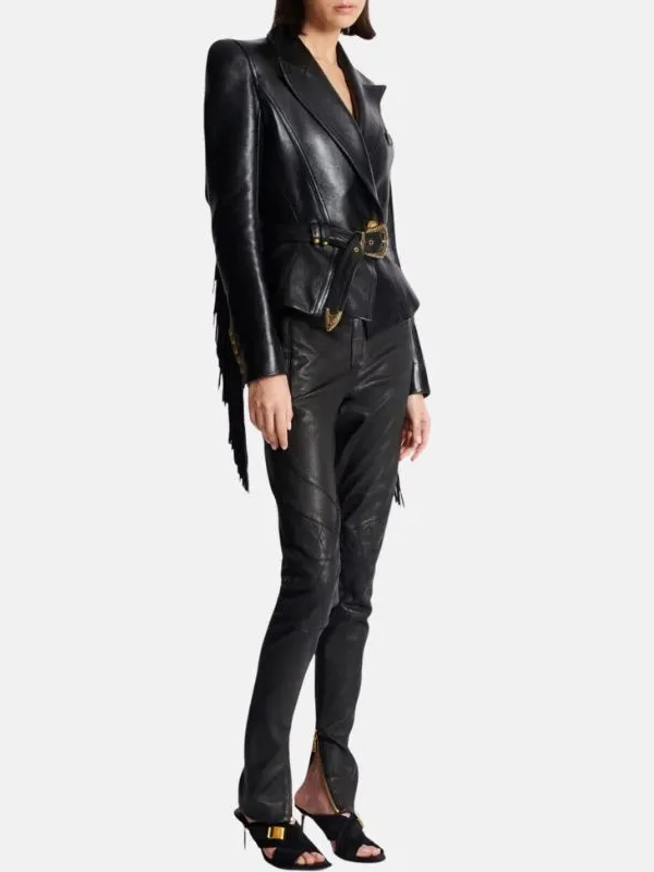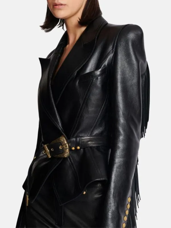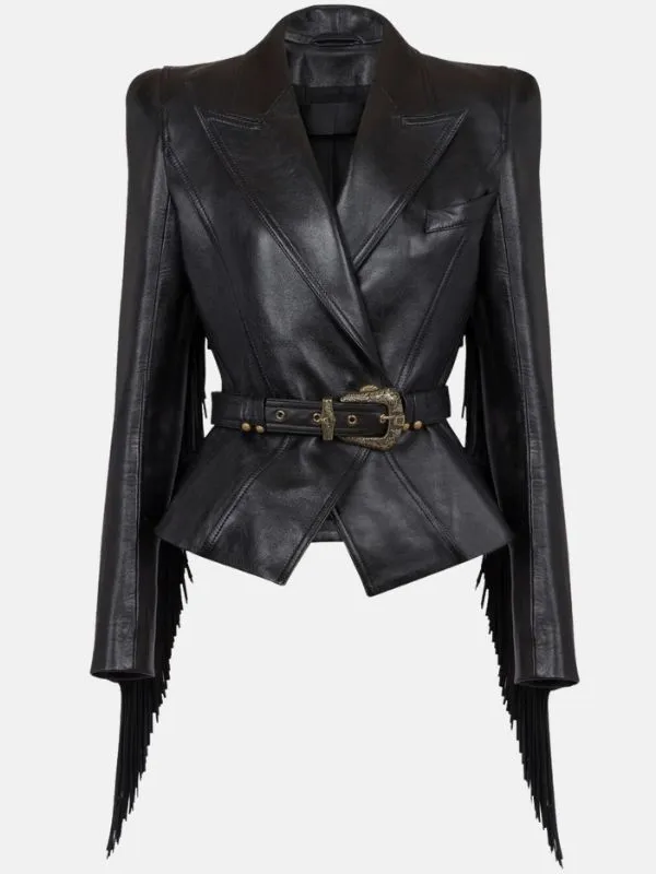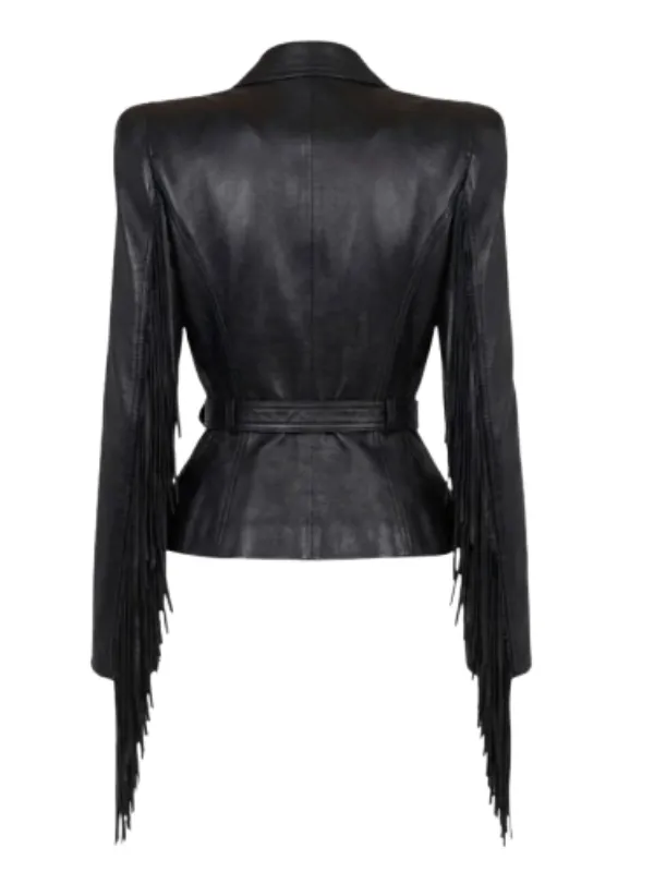 A sleek fringe jacket begins with lambskin leather, cut to move like water down each side. Inside, a slick polyester lining glides over thin silks or worn cotton shirts without catching. Sharp peak lapels stand tall at the neck, giving structure without stiffness.